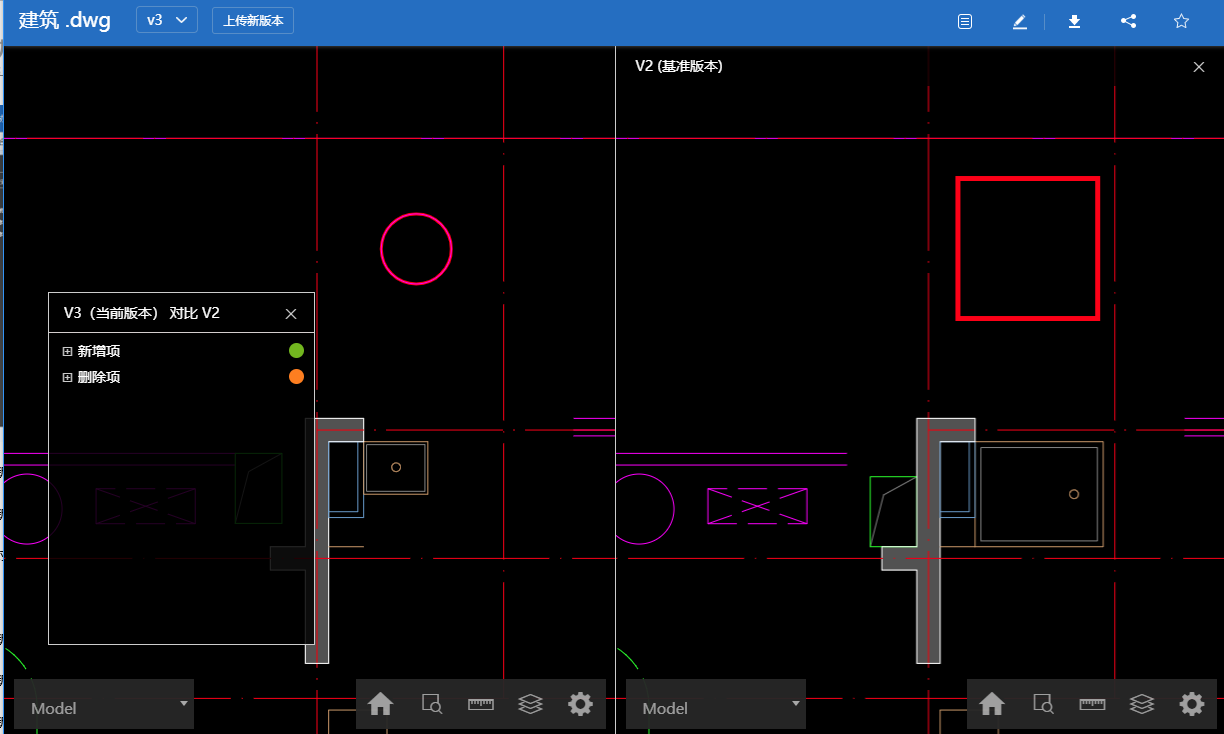 9、 新增DWG图纸版本对比查看的功能,自动与上一版本对比,也可指定任意版本进行对比。