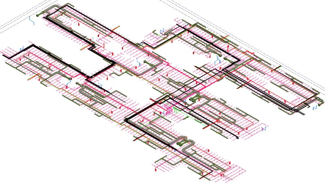 施工图设计阶段的BIM应用是各专业模型构建并进行优化设计的复杂过程。各专业信 息模型包括建筑、结构、给排水、暖通、电气等专业。在此基础上,根据专业设计、施工等 知识框架X,进行碰撞检测、三维管线综合、竖向净空优化等基本应用,完成对施工图阶 段设计的多次优化。针对某些会影响净高要求的重点部位,进行具体分析并讨论,优化机电 系统空间走向排布和净空高度。