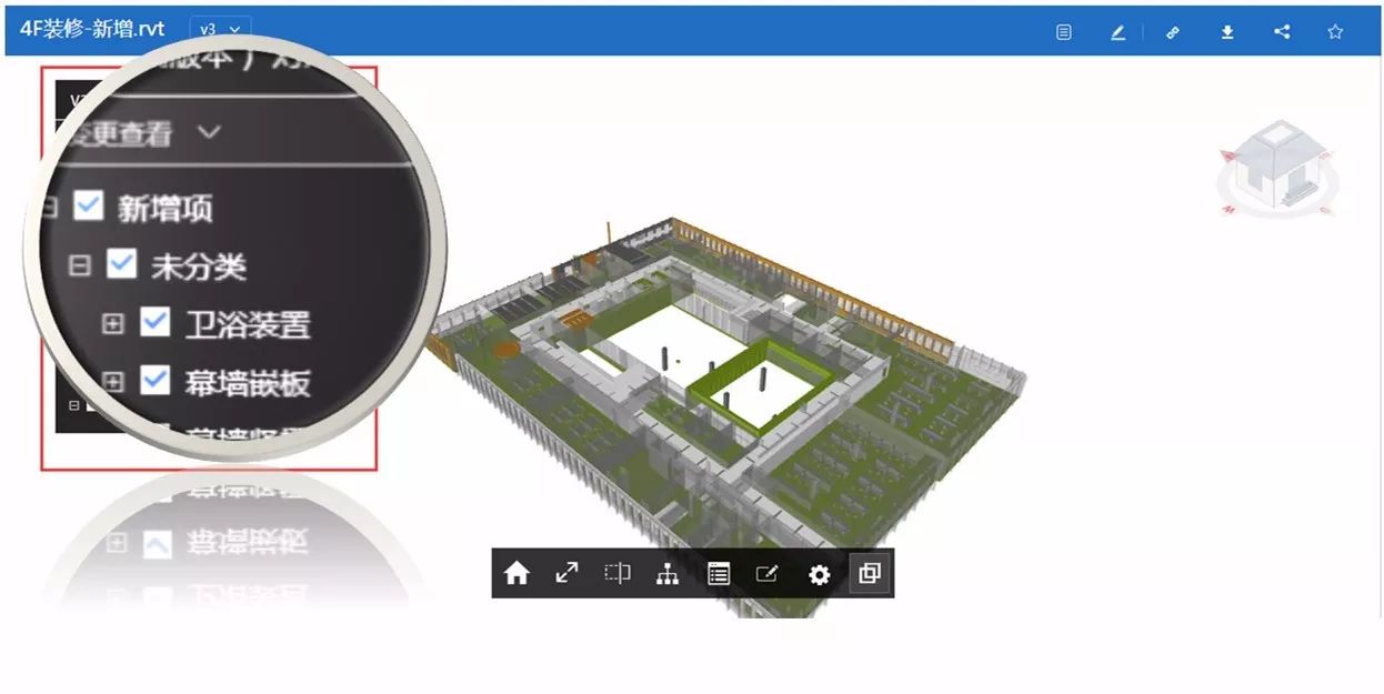 选择一个模型文件,工具条最右端的双框重叠按钮就是新的模型比对功能入口,可以在现版本的基础上自动生成与上一版本的比对内容。