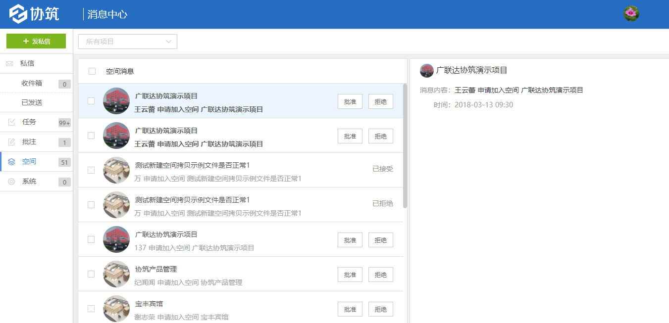 4. 全新的Web端消息中心模块,按照私信、任务、批注、空间、系统对消息进行归类,支持直接跳转查看文档、任务、批注等消息附属对象。【产品更新日志】2月动态-协筑