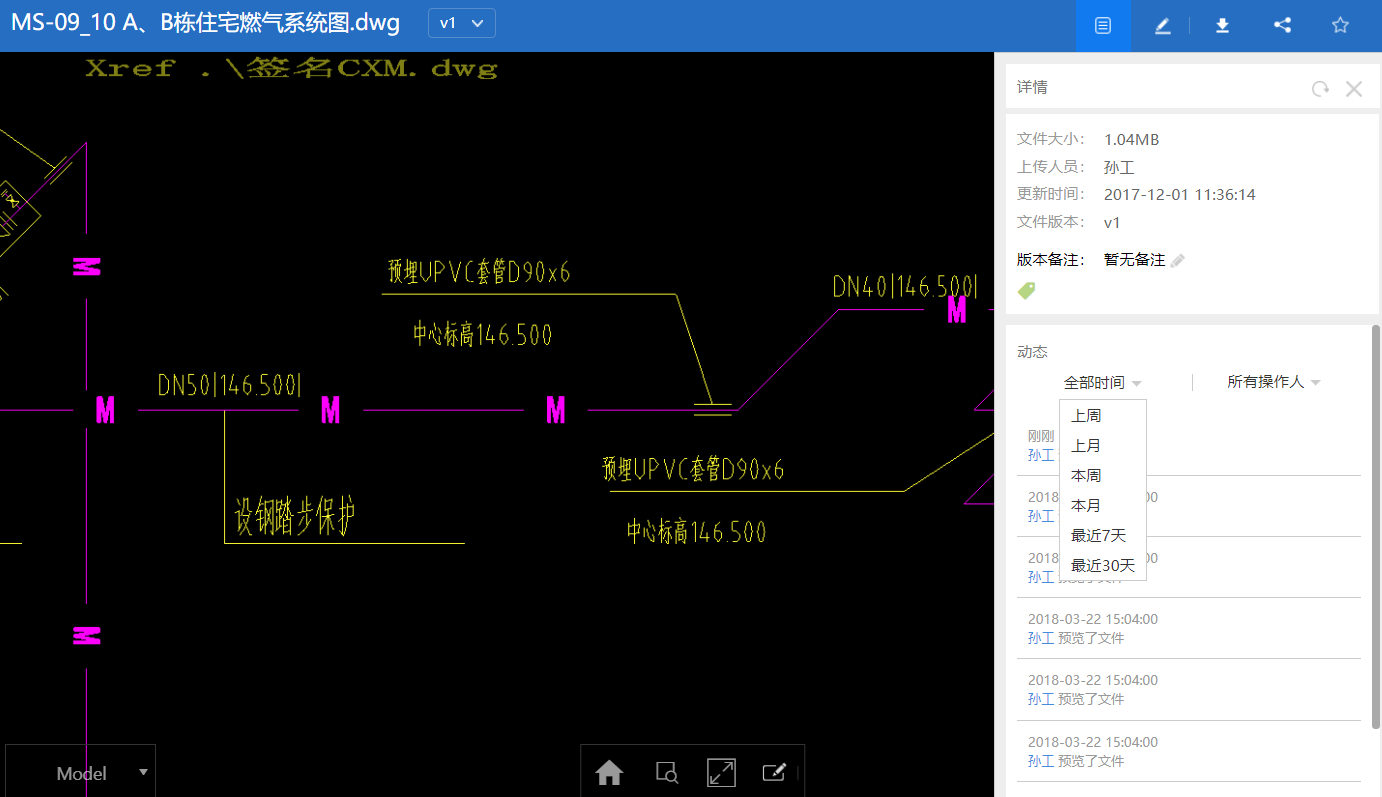 3. 新增单文件预览页中文件动态可以按时间、按操作人分类筛选的功能,通过该功能,可以快速地查找项目上某一成员是否下载或者预览了该文件,对于图纸分发的辅助管理很有价值,管理员可以方便地统计是否相关方都已经查阅了或者下载了该图纸,若是没有,可以通过@的功能,发私信给需要下载的人员,进行补充通知,保证所有的人员都已经下载了最新版本的图纸。